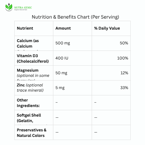 Nutra Genic Calso D is a powerful blend of Calcium and Vitamin D3 designed to support strong bones, healthy teeth, and overall vitality. Vitamin D3 helps your body absorb calcium efficiently, promoting better bone density and muscular strength.