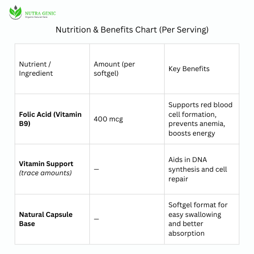 Nutra Genic Folimed is a premium dietary supplement formulated with 400 mcg of Folic Acid per softgel. Folic Acid (Vitamin B9) is an essential nutrient that plays a crucial role in the formation of red blood cells, DNA synthesis, and supporting maternal health during pregnancy. Regular supplementation may help reduce the risk of neural tube defects in developing babies, improve energy production, and support overall wellness.