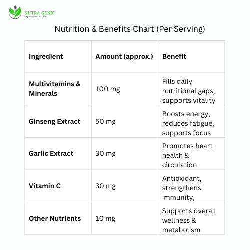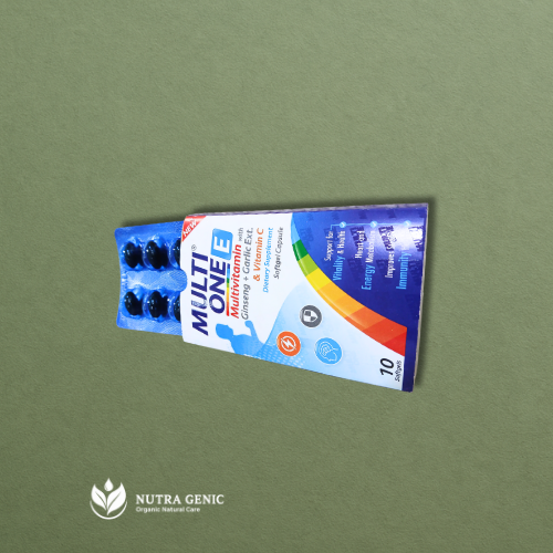 Nutra Genic Multi one Eis a premium multivitamin supplement designed to support daily energy, immunity, and overall vitality. Each softgel capsule combines essential multivitamins and minerals with the natural power of Ginseng Extract, Garlic Extract, and Vitamin C, offering a complete health solution in one formula.